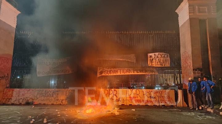 Aksi sudah berlangsung sejak pukul 13.00 WIB yang berlanjut hingga malam hari. Pantauan Tempo pukul 19.00 WIB, peserta demo menggelar aksi teatrikal yang diwarnai pembakaran ban serta spanduk di depan gerbang gedung parlemen.