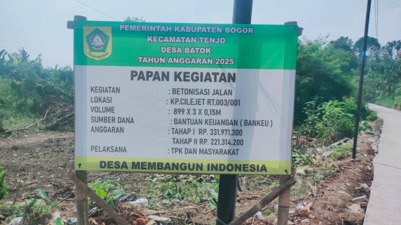 Bogor,portalMCA — Warga Kampung Cilejet Desa Batok Kecamatan Tenjo Kabupaten Bogor kini bisa tersenyum lega, pasalnya jalan desa yang sebelumnya rusak dan penuh lubang kini telah berubah menjadi jalan beton yang mulus dan kokoh.