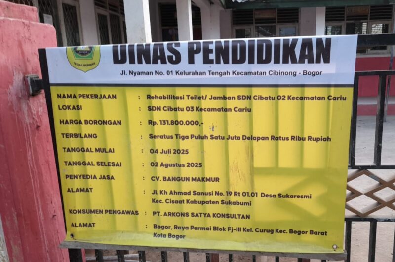 Bogor,portalMCA — Proyek rehabilitasi toilet di SD Negeri Cibatu 02, Kecamatan Cariu, Kabupaten Bogor, menjadi sorotan tajam publik. Proyek senilai Rp 131.800.000 yang bersumber dari dana pemerintah ini dinilai tidak transparan dan menimbulkan berbagai pertanyaan.