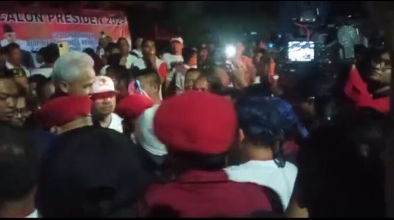Walaupun di guyur hujan relawan tetap setia menuggu kedatangan Calon Presiden PDIP Ganjar Pranowo .