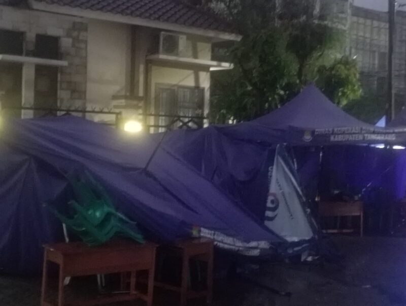 Tangerang, Portalmca.com —- Hujan deras disertai angin kencang mengguyur wilayah Tigaraksa dan sekitarnya sore ini. Hujan disertai angin kencang membuat stand “Pelayanan Mantap Jasa”yang berada di lokasi bundaran perum Sudirman indah Kelurahan Tigaraksa Kecamatan Tigaraksa Kabupaten Tangerang roboh, Sabtu, (04/11/2023)